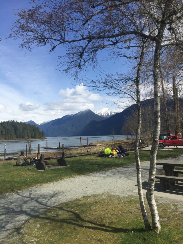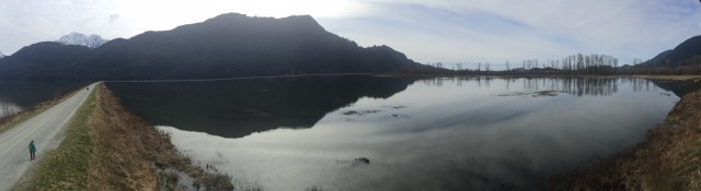 Loopers J&M hopped in their car (for the first time in 3 weeks+) and headed east for their April walk, destination Pitt Lake, for a stroll along the dykes of Pitt Polder and the Pitt-Addington Marsh Wildlife Management Area. The theme was “Reflections”, for there seemed to be more reflections than things to reflect. Pitt Lake’s parking lot was closed (as at many others’ local parks: in Deep Cove; Cates Park etc) so they (we) parked roadside, just outside the gate, continuing from there to the lake, and then clockwise along the dykes, in a 6km+ triangle route. To add a few more km, we followed another grassy dyke beside the Pitt River, looping back (yes!) to our car. Total distance covered was about 11km. Many others were out walking on the dykes, but social distancing was followed at all times (note: the path along final leg of the initial triangle is narrow, necessitating the occasional leap into the bushes). Channeling the Mighty Jon, we took frequent photos to document our walk [Ed: a limit has been imposed on the number of photographs per group]. Afters were consumed at home, including a chocolate hazelnut croissant picked up en route from Chez Christophe (note: they will deliver orders of $35 plus to Burnaby addresses!).