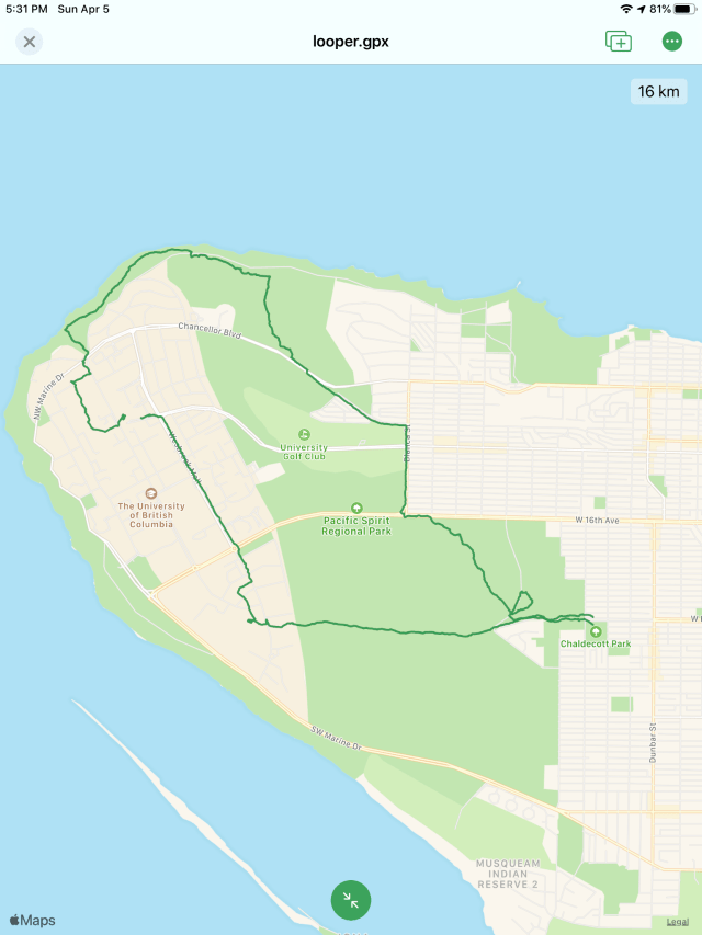 I did about 16km through various parts of Pacific Spirit park and connecting roads. Kept mostly to wider trails to simplify the distancing issue. (Though some of the larger family groups also seemed to prefer these trails while moving at toddler speed!)