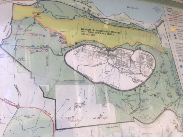 - Made up of various trails on Burnaby Mountain: a mix of Trans Canada Trail, Pipeline Trail, and a couple of mountain bike/dual-use trails including the aptly-named “Sidewinder”