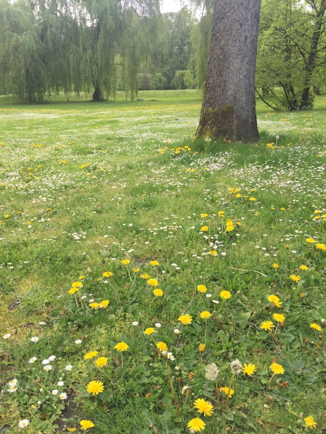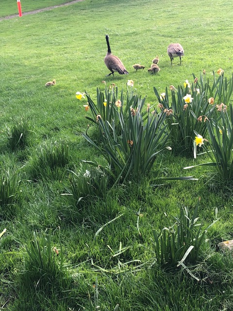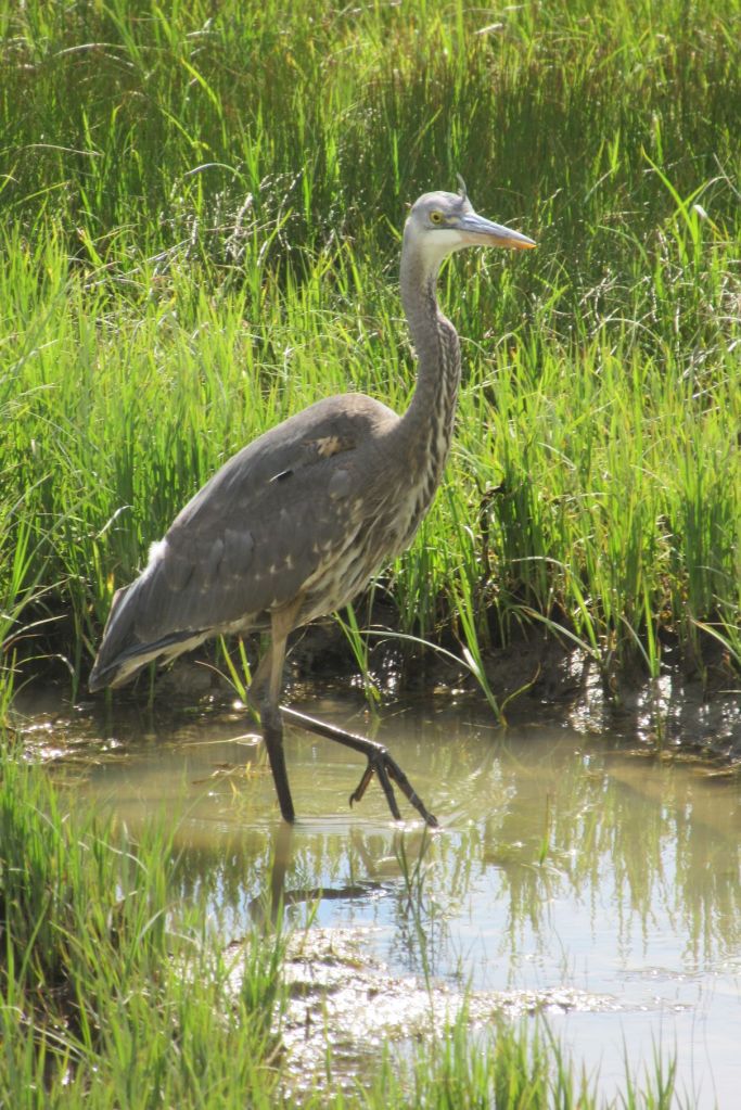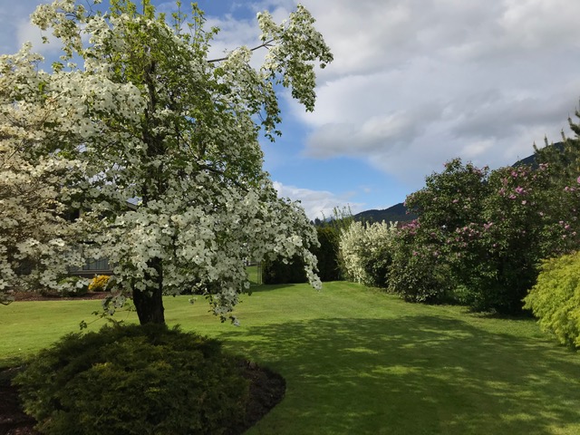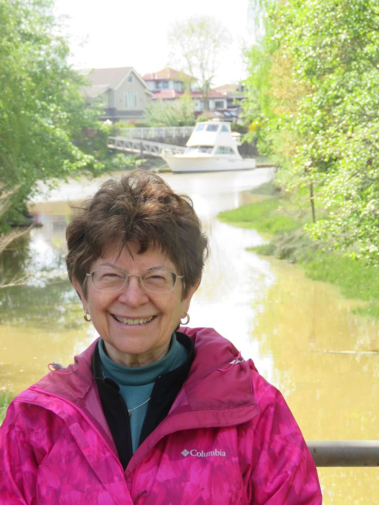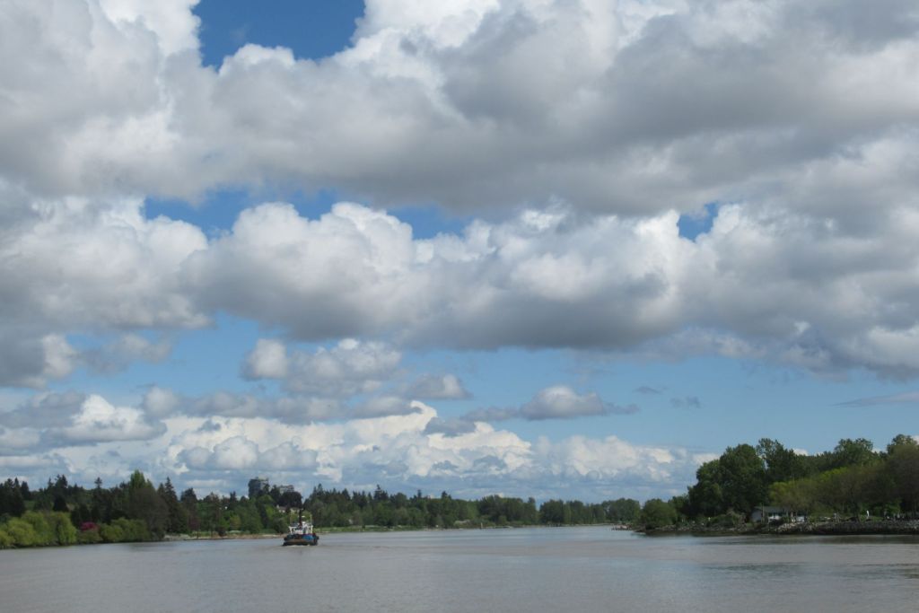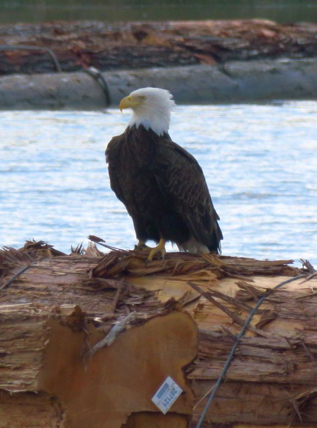 My faithful photographer generously offered to accompany me on my mini-May Loopers walk on and near the River Trail in Southlands. Starting at the foot of Blenheim, we could see across the Fraser River to where his morning Loopers outing had been. My gradually improving but sore knee appreciated this flatland outing. And the warmth of the unexpectedly brilliant afternoon sun was spirit lifting. The photographer was ecstatic at snapping both an eagle (which was hitching a ride on a log boom) and a wading heron. Not documented were the many dogs, horses and happy locals sharing the path with us even though we both were taking pictures.