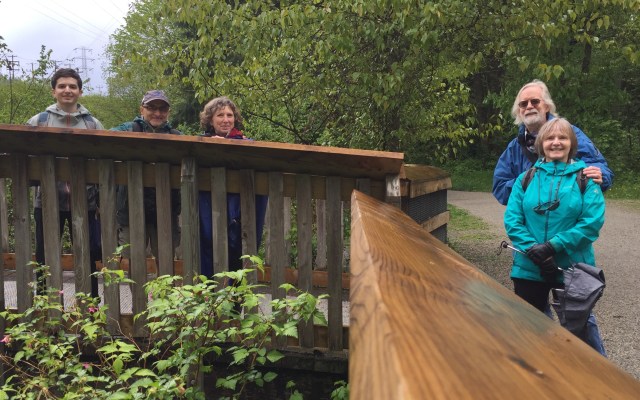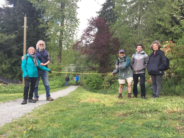 We started from Noel Drive, near the midpoint, where a staircase provides access to the Stoney Creek Trail, which we followed south to Brunette Creek, continuing to Hume Park. Quite a few others were also out and about, walking and cycling the paths on a sunny afternoon. This made it a bit challenging at times to maintain proper distancing with all concerned. Fortunately Fred usually carries a tape measure with him (as demonstrated in the starting selfie). During our return leg the clouds rolled over and rain began to fall, allowing Joette to deploy her famous blue raincoat.