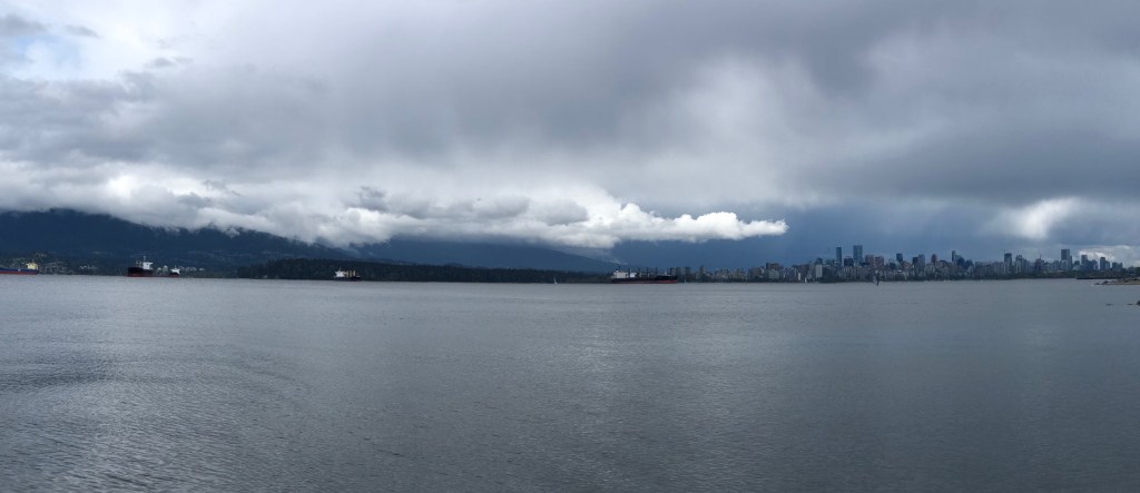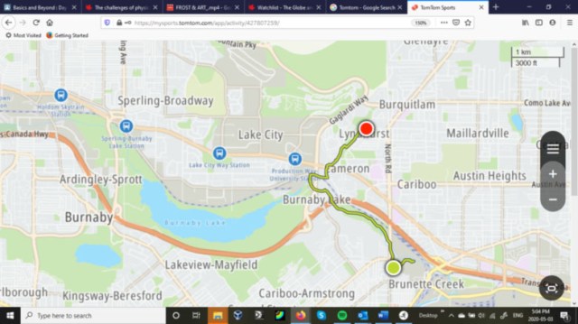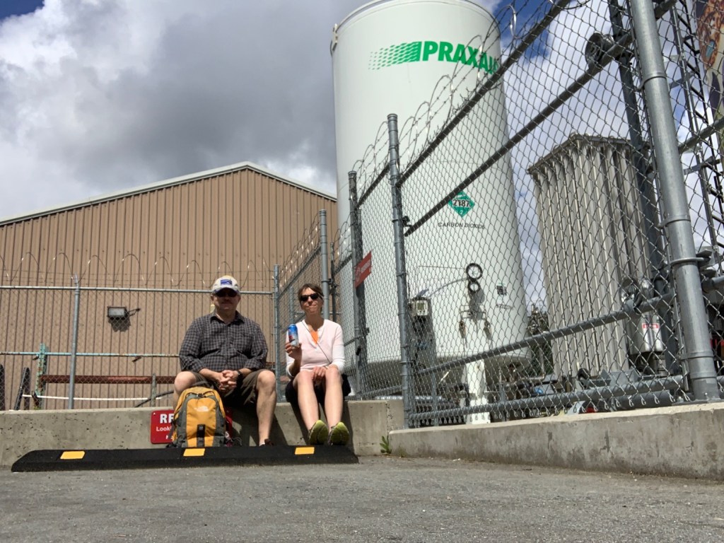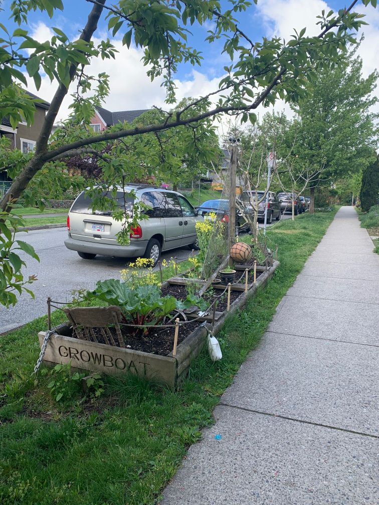 We went West on Venables past the local Growboat to Strathcona community garden and the orchard. We then cut down by the train station to Science World where Carol became a Jetty Master. We saw some interesting markings on the ground of locomotives or their routes. We went West past Red Truck Brewing where we discovered a yummy food truck — great hotdogs — and split one “Durings” beer, instead of “Afters”. Finally home through Grandview Woodland area. We did about 10km.