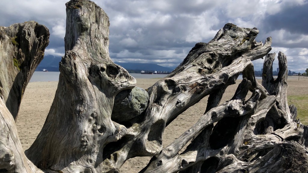The more natural north trail stretches oceanward for almost 5 km, through beach grass and woods, and finally out to the narrow spit itself. We walked on the lee side to watch the tugboats at work moving log booms and were simultaneously entertained by a family of geese on a training mission — the five goslings were coaxed into several return paddles out to the booms. A lone heron teased us by flying laps down the beach, landing and patiently waiting for us to get almost close enough for a classic photo before taking off again. Returning on the ocean side, as loopy as we could get, we noted several lovely driftwood structures, architectural and artistic, and a siege of herons feeding far out on the tidal flats.