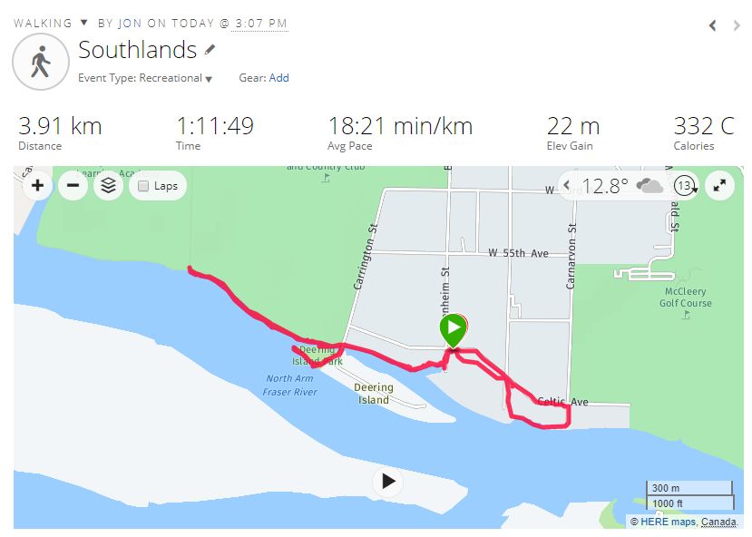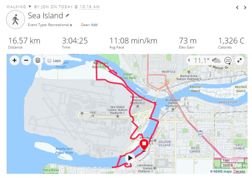 Joanne and I walked from Arbutus and McNicoll to Science World and back, a distance of about 9.6 km.