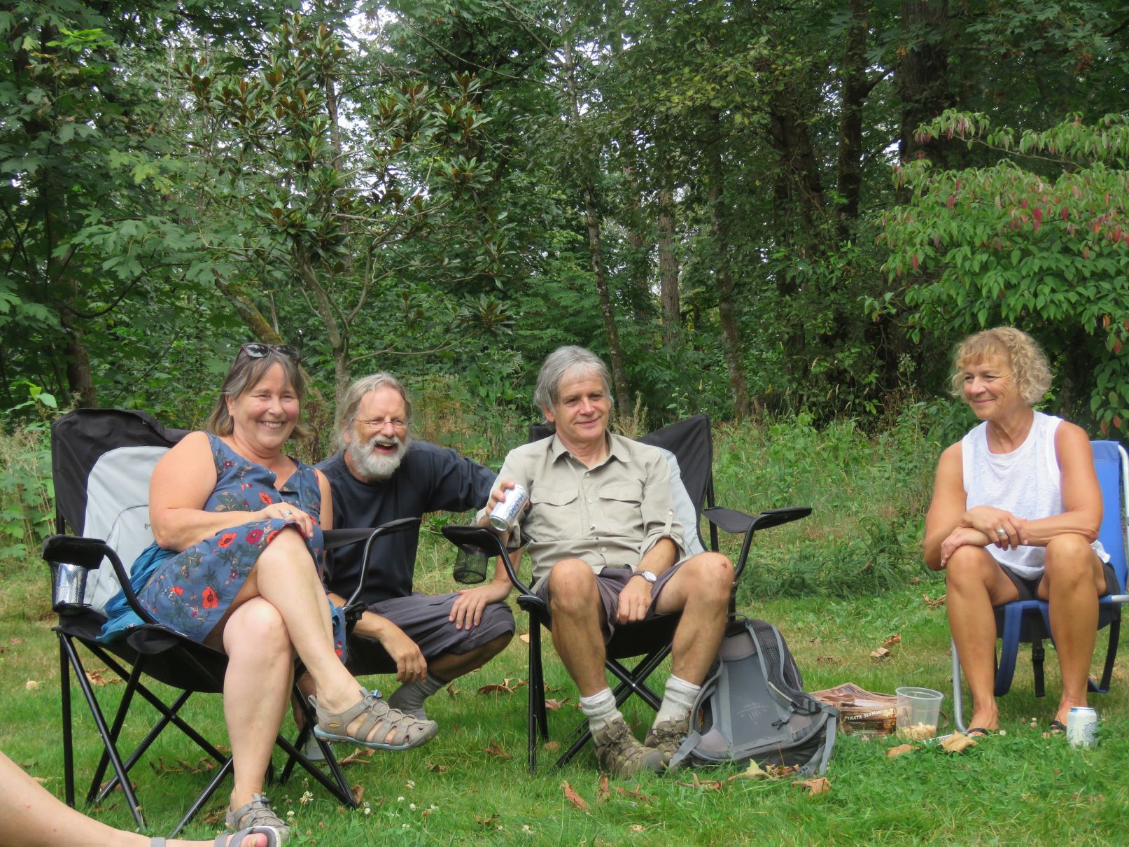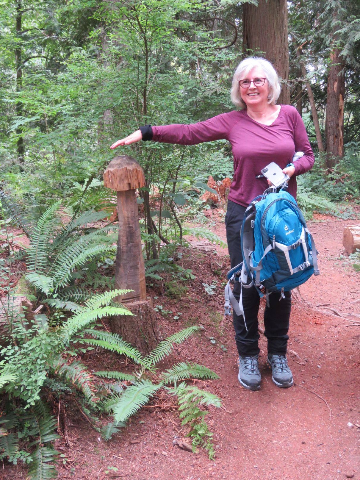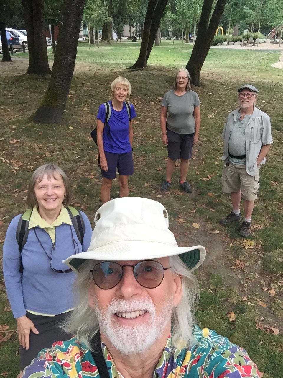 We (Janet S., Larrie, Adrienne, and Jean, with Michael leading) met at Lions Park just before 10:00 — while there were still parking spots available. Lower Mainland parks like this (and their parking lots), as well as walking trails everywhere, are in high demand this summer, particularly on weekends.