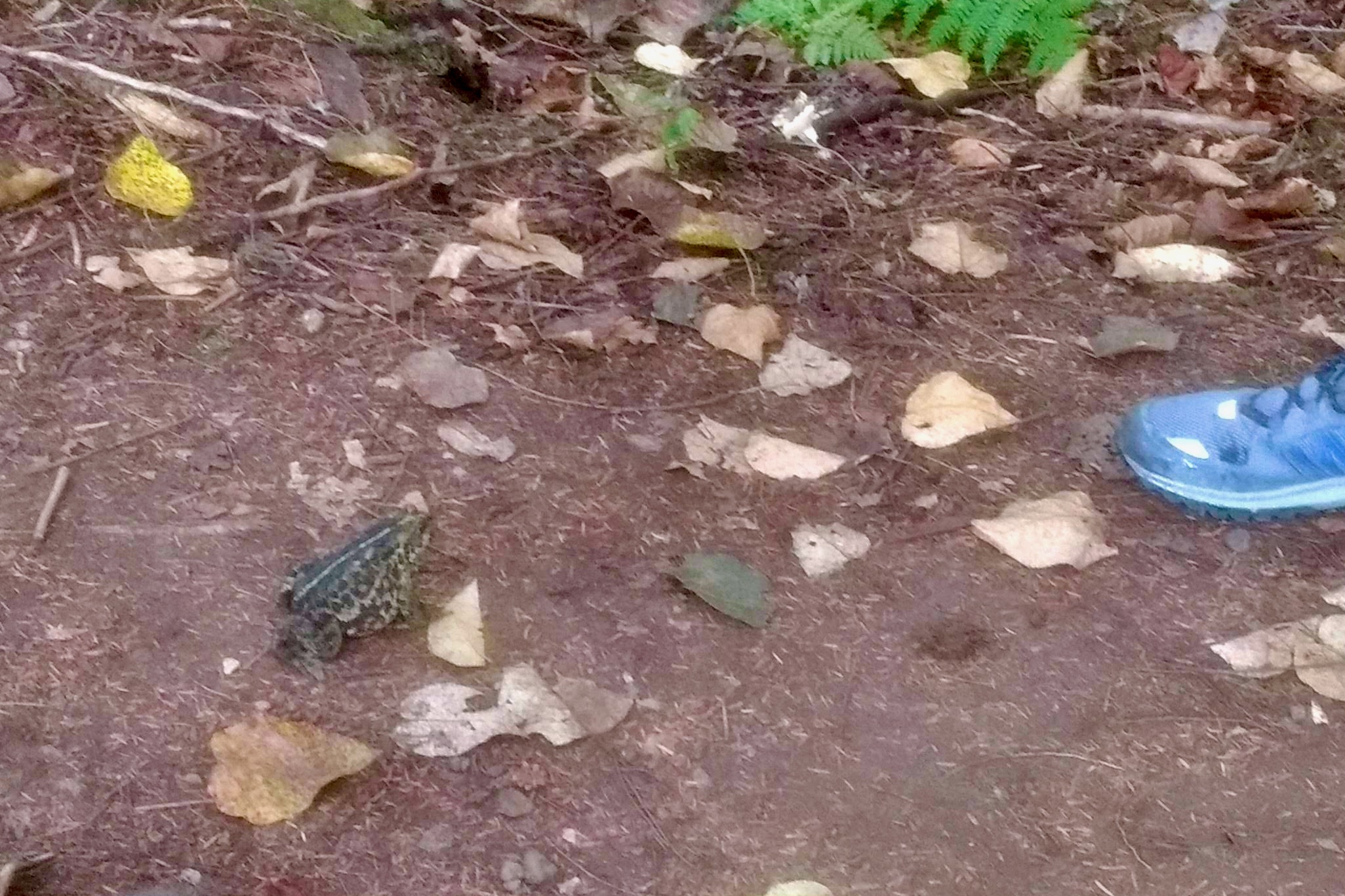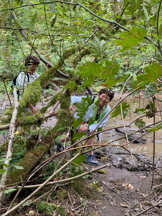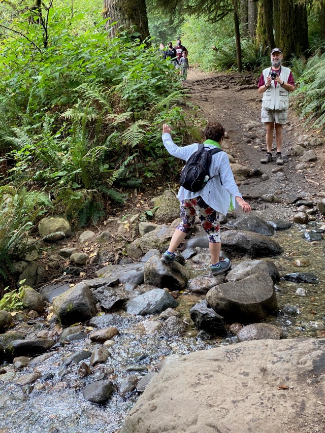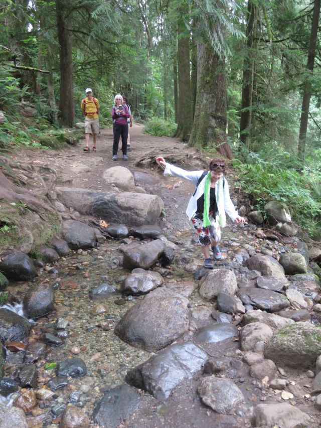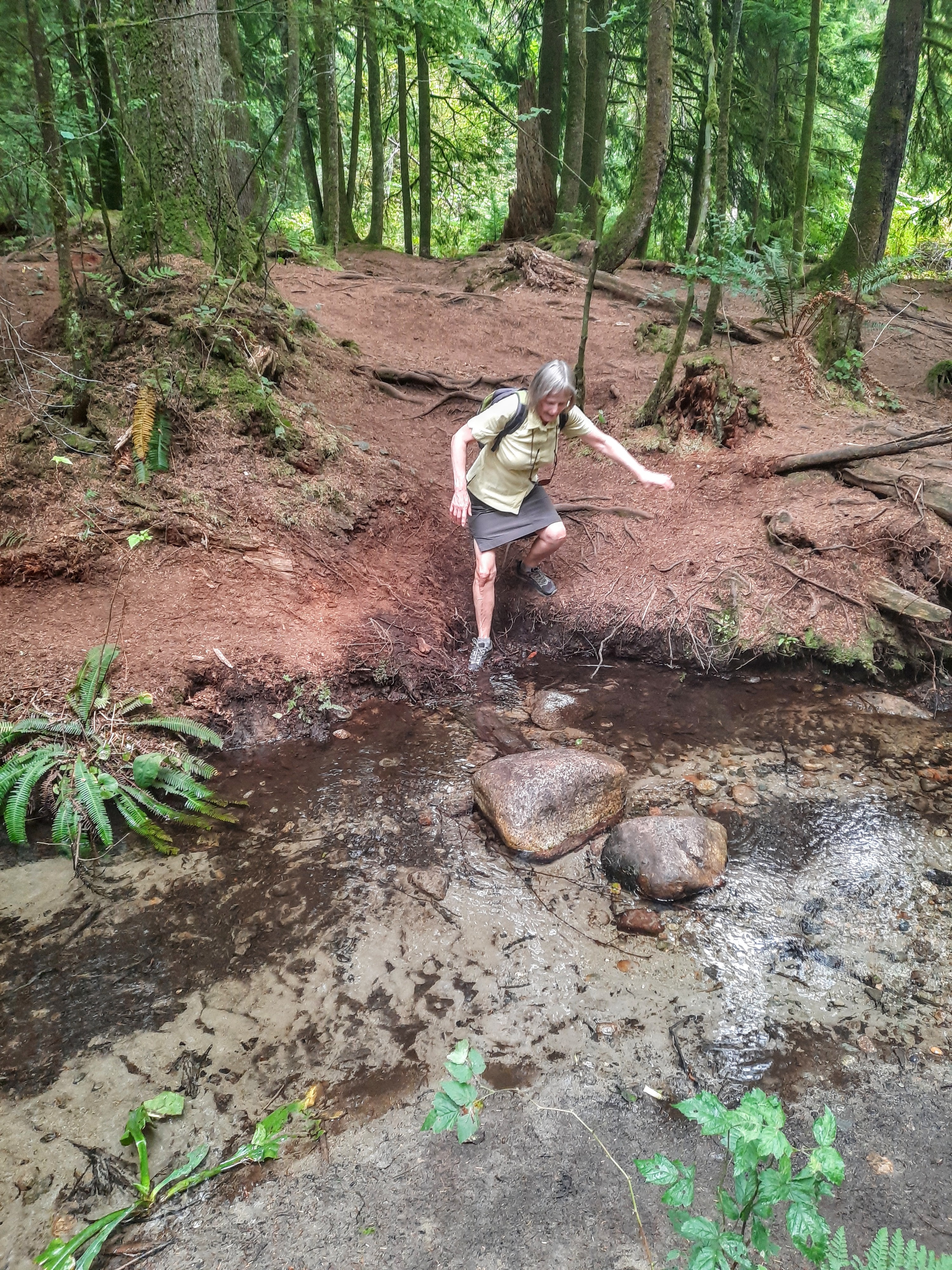 Our group managed to cross or avoid the muddy stretches quite smoothly. We particularly commend (a) Gord, for apparently walking on water and having his orange shoes remain completely unscathed, and (b) Liz, for her creative combination of hiking with yoga and/or ballet movements.