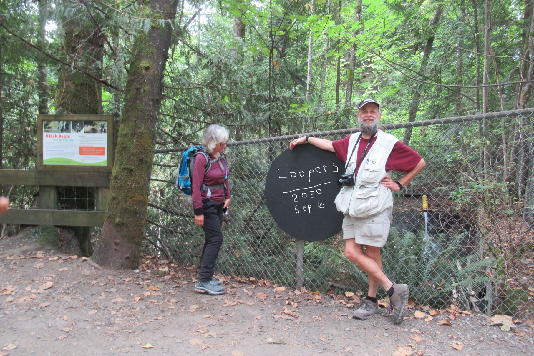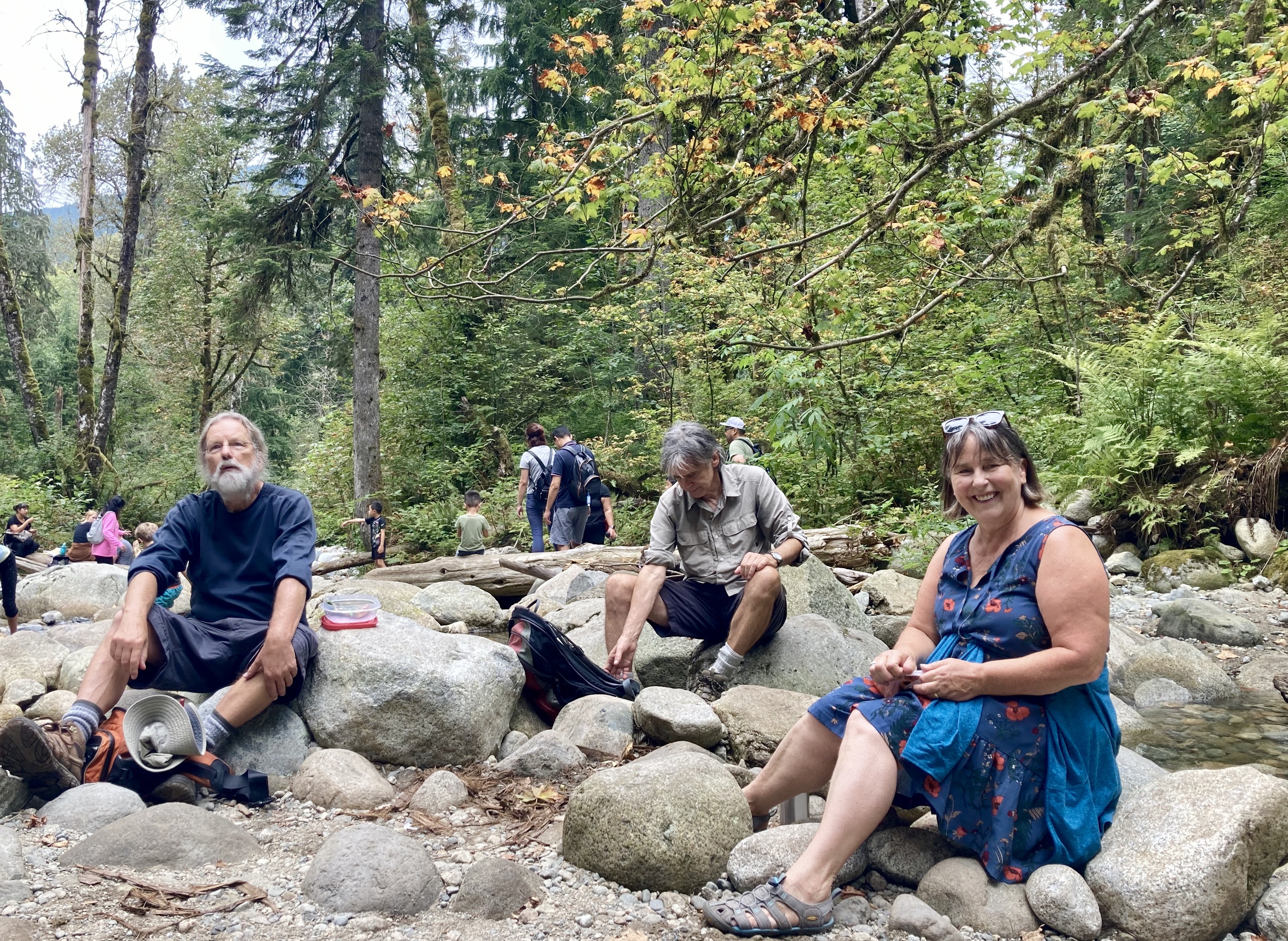 After a brief snack break at the foot of the falls, we retraced our steps, meeting Groups 2 through 4 at roughly 15-minute intervals. At David Avenue, we crossed the Coquitlam River to follow the path on the west bank downstream, crossing back at Patricia Avenue. Following a quick head count at Lions Park (to ensure that no Looper had been left behind) we set up chairs beside a birthday piñata to await the remaining groups.