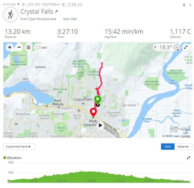 The route north along the east bank of the Coquitlam River was easy to follow. On the last section, from the trailhead to Crystal Falls, the trail was rougher, narrower, and muddier (in spots), with significantly more walkers.