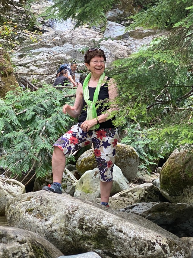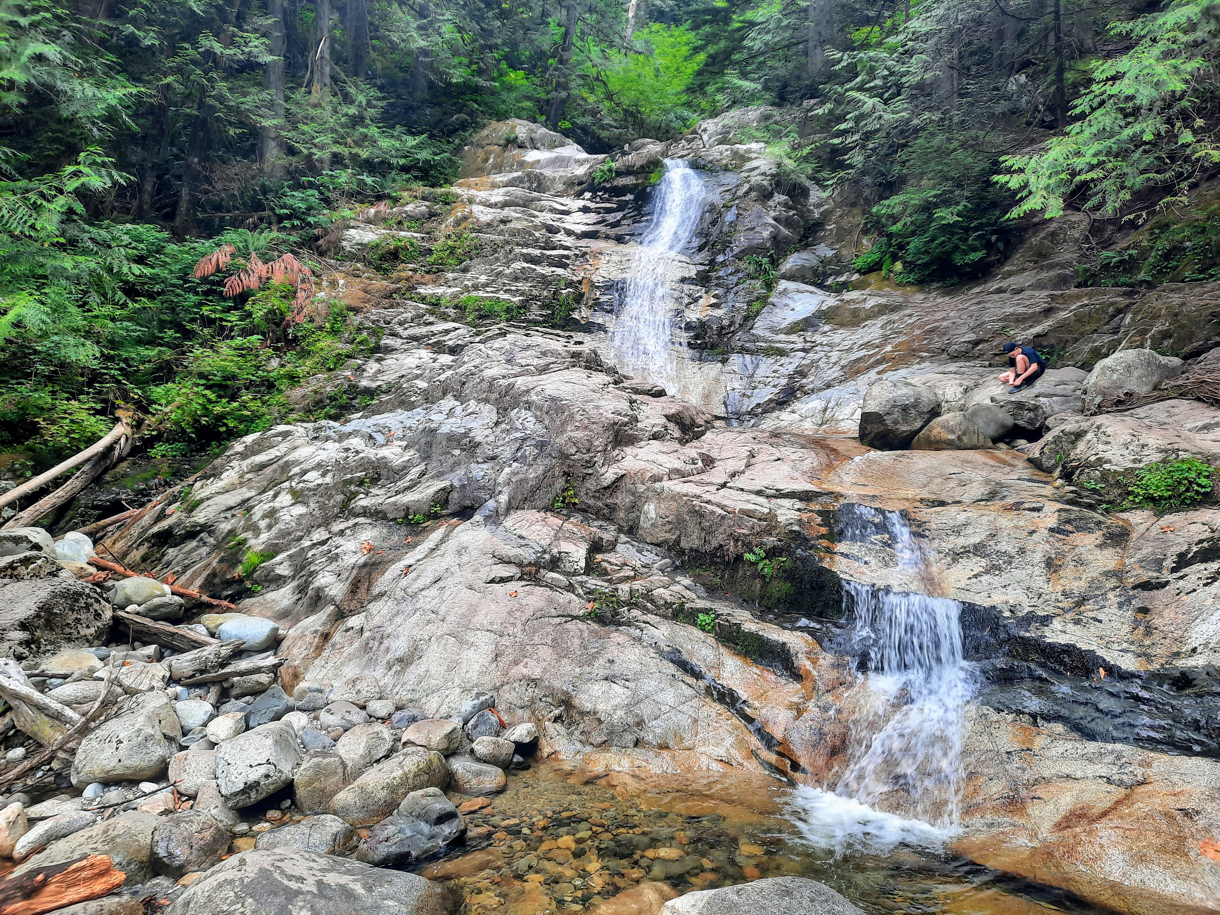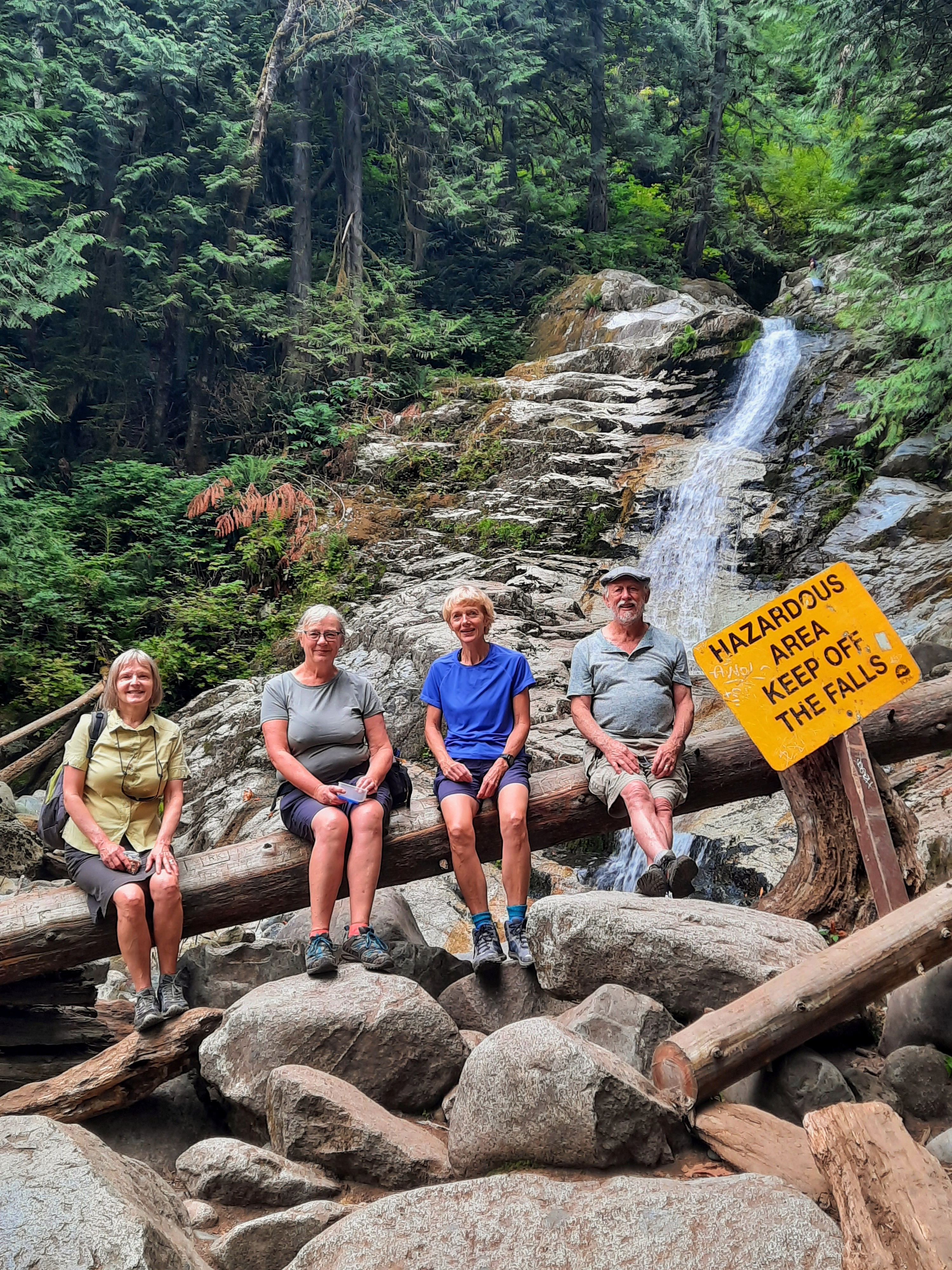 This month’s walk follows the Coquitlam River north from Lions Park along a combination of gentle, wooded stretches of the Traboulay, PoCo, and Trans Canada Trails until you emerge at David Avenue. You walk on the road for a short distance and then cross to find the entrance to the Crystal Falls Trail. This section has more rocks and roots underfoot, but it is a very gentle slope up to the falls — at which point, the official plan was to retrace our steps back to the start. Some groups chose to vary the river section on the return by walking on the west side.